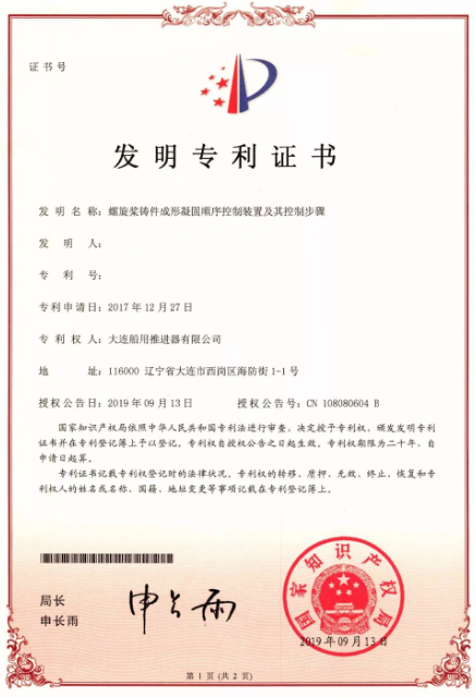 ????近日,大連船推申請的《螺旋槳鑄件成形凝固順序控制裝置及其控制步驟》發明專利通過國家知識產權局審查,獲得國家發明專利授權。