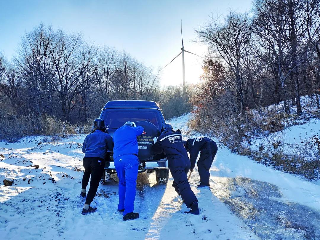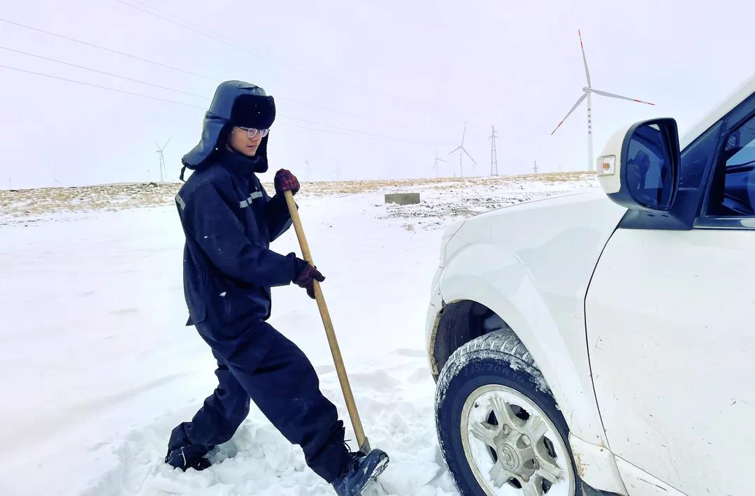 進入11月,內蒙古自治區(qū)錫林郭勒盟地區(qū)迎來大面積的暴風雪,烏達萊項目人員在趕往風場的路上遭遇積雪路段,雖然氣候嚴寒,但為了及時消除機組故障,大家在積雪路段采取挖雪推車的方式齊心協(xié)力,一同開展清理路面積雪的行動。這個冬日,冰雪阻擋不住海裝追風者們勇往直前的步伐,他們只為恪盡職守完成一個承諾——風機旋轉、帶來光熱。