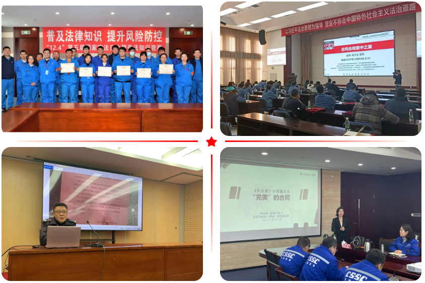 ▲ 江南造船、中船九院、重齒公司、河柴重工、江淮重工、七〇八所、七〇九所、七一六所等單位通過線上與線下相結合的方式開展法律知識競賽;七一七所、七二二所等單位拍攝制作普法微視頻;中船澄西、中船財務、中船投資、物資公司、各平臺型上市公司、中船綠洲、中船風電、漢光重工、長江科技、七一〇所、七一一所、上船院等多家單位舉辦專題法治講座;七六〇所舉辦民法典熱點問題交流沙龍;八院組織業(yè)務部門重點崗位人員旁聽庭審。