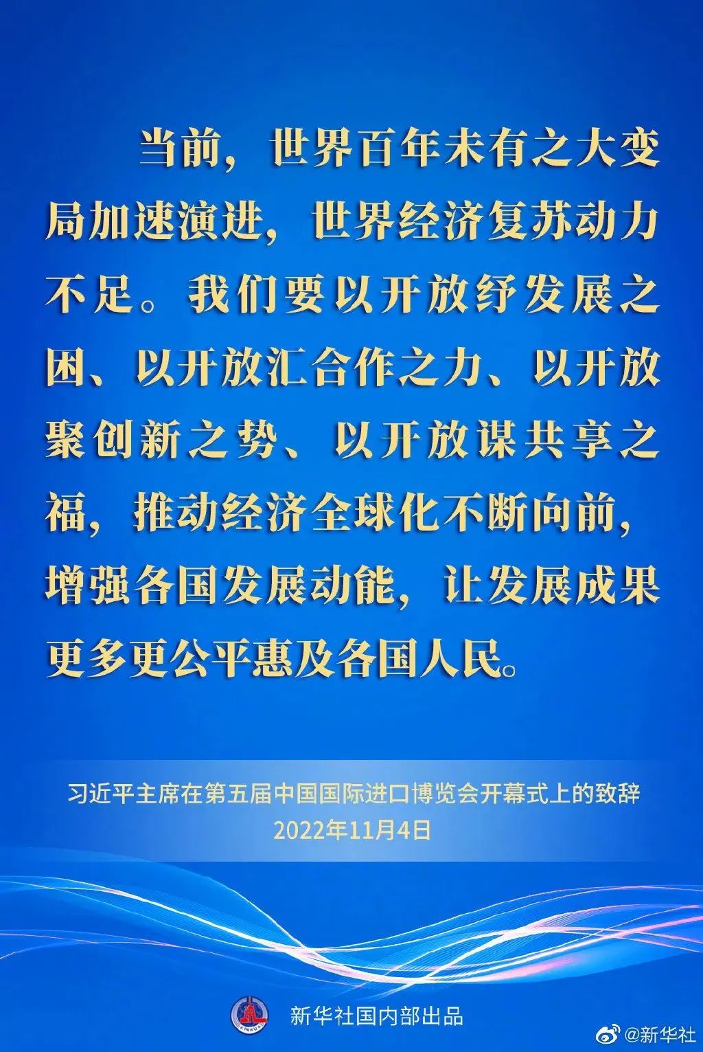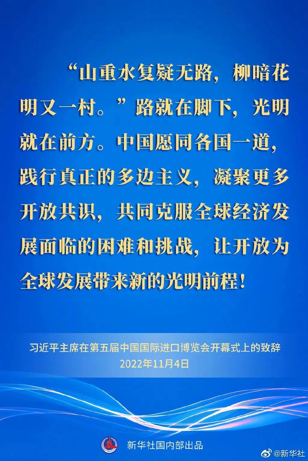 習(xí)近平最后強(qiáng)調(diào),路就在腳下,光明就在前方。中國(guó)愿同各國(guó)一道,踐行真正的多邊主義,凝聚更多開(kāi)放共識(shí),共同克服全球經(jīng)濟(jì)發(fā)展面臨的困難和挑戰(zhàn),讓開(kāi)放為全球發(fā)展帶來(lái)新的光明前程!