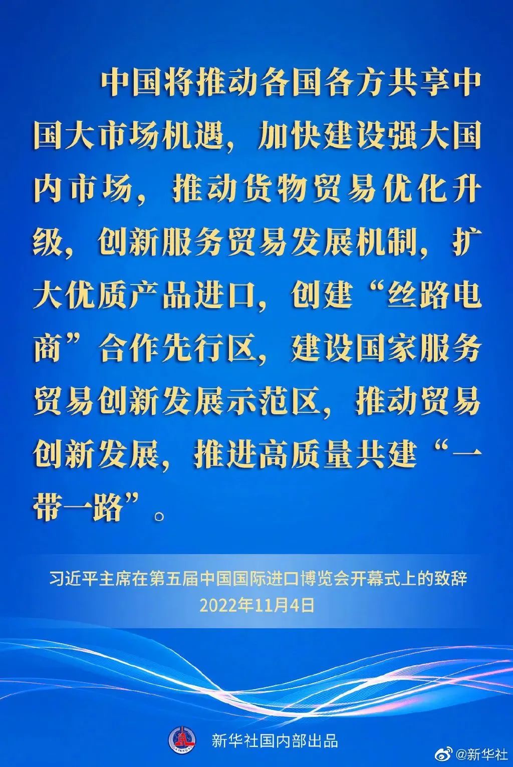 ——中國(guó)將推動(dòng)各國(guó)各方共享中國(guó)大市場(chǎng)機(jī)遇,加快建設(shè)強(qiáng)大國(guó)內(nèi)市場(chǎng),推動(dòng)貨物貿(mào)易優(yōu)化升級(jí),創(chuàng)新服務(wù)貿(mào)易發(fā)展機(jī)制,擴(kuò)大優(yōu)質(zhì)產(chǎn)品進(jìn)口,創(chuàng)建“絲路電商”合作先行區(qū),建設(shè)國(guó)家服務(wù)貿(mào)易創(chuàng)新發(fā)展示范區(qū),推動(dòng)貿(mào)易創(chuàng)新發(fā)展,推進(jìn)高質(zhì)量共建“一帶一路”。