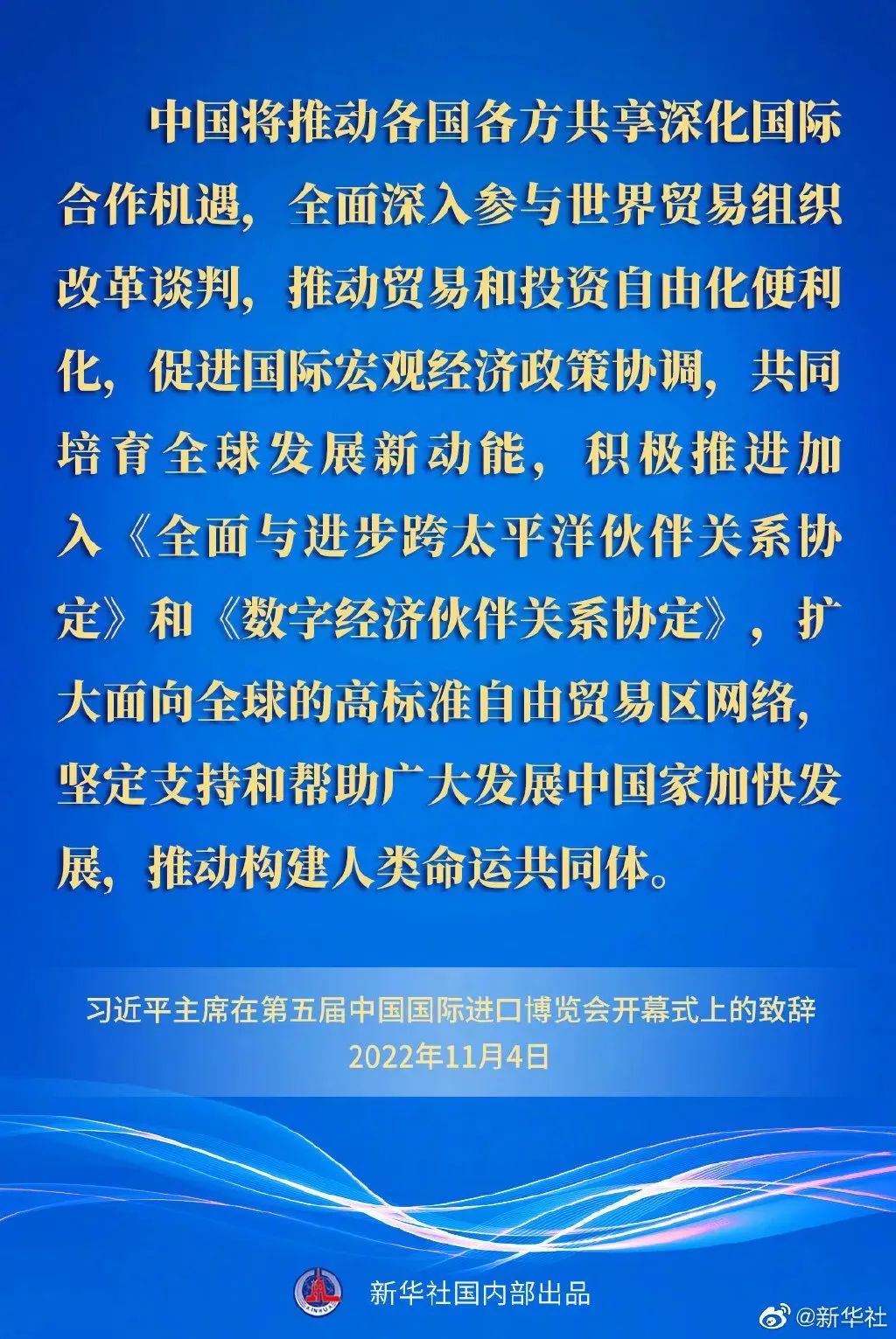 ——中國(guó)將推動(dòng)各國(guó)各方共享深化國(guó)際合作機(jī)遇,全面深入?yún)⑴c世界貿(mào)易組織改革談判,推動(dòng)貿(mào)易和投資自由化便利化,促進(jìn)國(guó)際宏觀經(jīng)濟(jì)政策協(xié)調(diào),共同培育全球發(fā)展新動(dòng)能,積極推進(jìn)加入《全面與進(jìn)步跨太平洋伙伴關(guān)系協(xié)定》和《數(shù)字經(jīng)濟(jì)伙伴關(guān)系協(xié)定》,擴(kuò)大面向全球的高標(biāo)準(zhǔn)自由貿(mào)易區(qū)網(wǎng)絡(luò),堅(jiān)定支持和幫助廣大發(fā)展中國(guó)家加快發(fā)展,推動(dòng)構(gòu)建人類(lèi)命運(yùn)共同體。