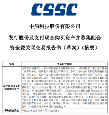 10月10日,中國船舶集團有限公司旗下上市公司中船科技股份有限公司發(fā)布《發(fā)行股份及支付現金購買資產并募集配套資金暨關聯(lián)交易報告書(草案)》等公告。根據公告,中船科技擬通過發(fā)行股份及支付現金的方式購買交易對方持有的交易作價合計約為91.98億元的標的資產,并擬非公開發(fā)行股票募集不超過30億元的配套資金。該草案的公布標志著中船科技重大資產重組取得具有里程碑意義的重要進展。