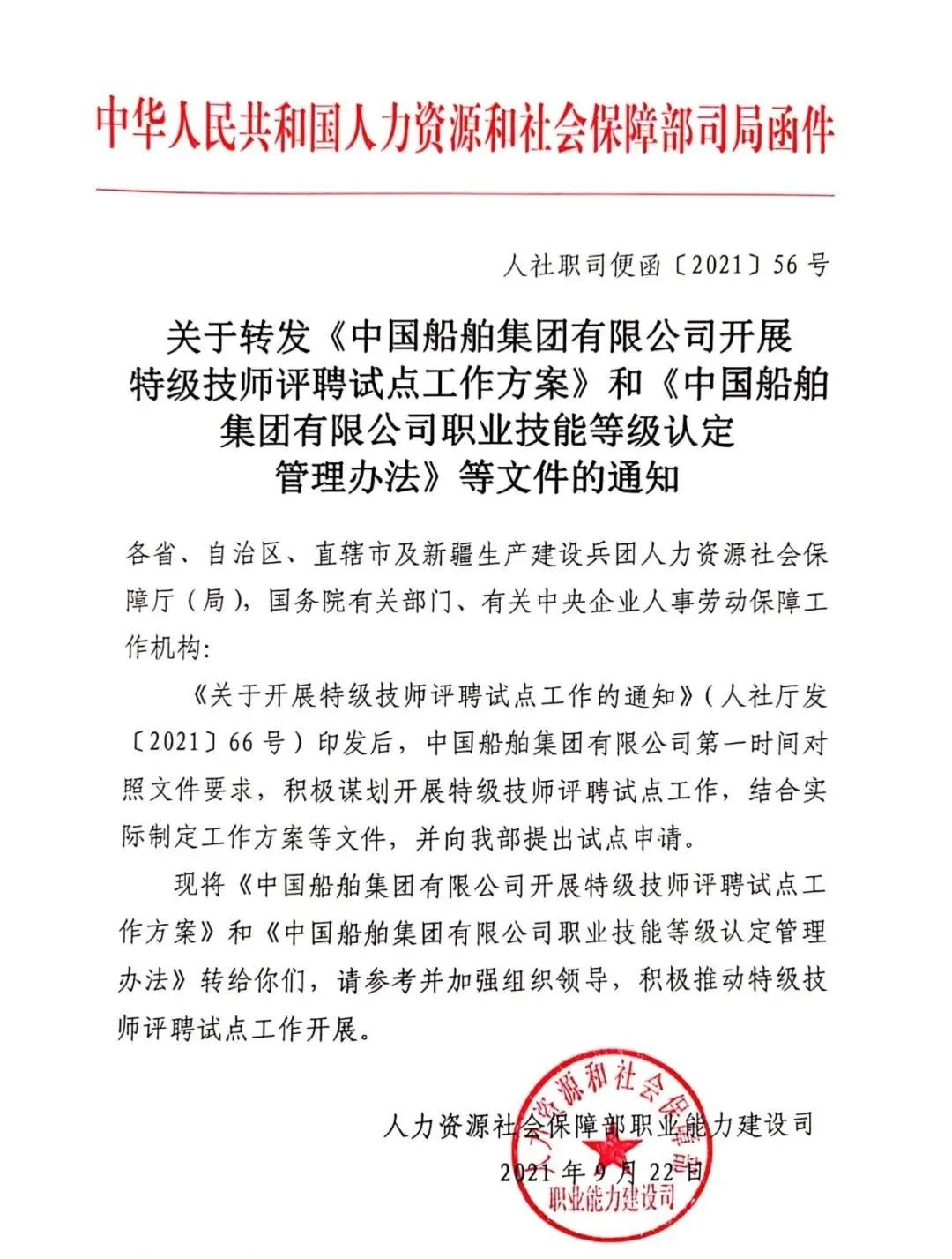 通知發(fā)布后,中國(guó)船舶集團(tuán)第一時(shí)間對(duì)照文件要求,積極謀劃開展特級(jí)技師評(píng)聘試點(diǎn)工作,集團(tuán)公司黨組審議出臺(tái)《職業(yè)技能等級(jí)認(rèn)定管理辦法》,進(jìn)一步明確以“特級(jí)技師”為塔尖的六個(gè)技能等級(jí),第一時(shí)間制定特級(jí)評(píng)聘工作方案,積極向人社部申報(bào)特級(jí)技師評(píng)聘試點(diǎn)。同時(shí)部署了2021年特級(jí)技師評(píng)審工作,今年計(jì)劃增加80名左右特級(jí)技師。