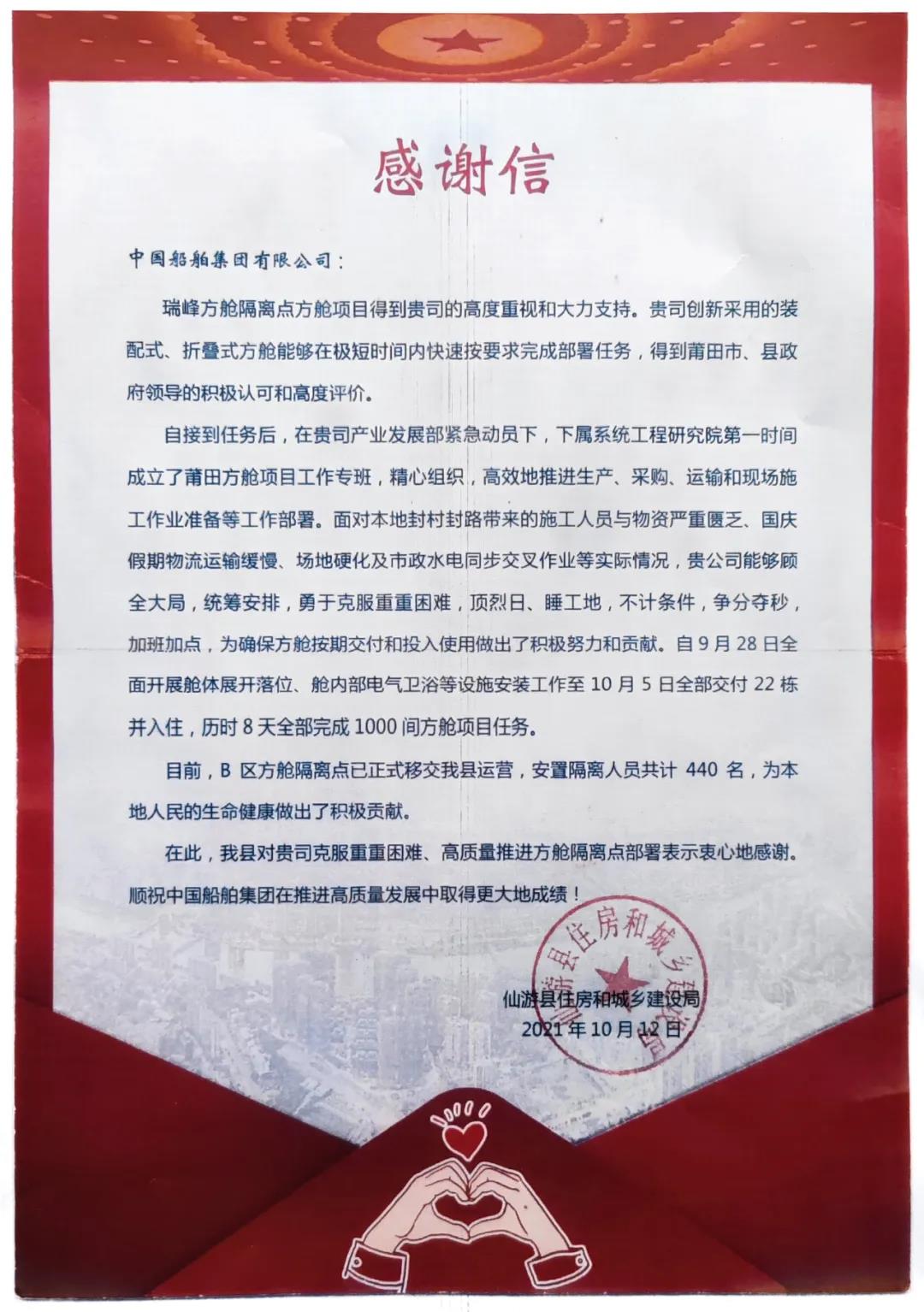 近日,中國船舶集團收到了福建省莆田市仙游縣住房和城鄉建設局發來的一封感謝信。