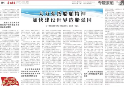 11月23日,中共中央黨校主辦的以思想理論宣傳為主旨的中央級(jí)大報(bào)《學(xué)習(xí)時(shí)報(bào)》刊發(fā)了中國(guó)船舶集團(tuán)有限公司黨組副書(shū)記、總經(jīng)理?xiàng)罱鸪墒鹈恼隆洞罅霌P(yáng)船舶精神 加快建設(shè)世界造船強(qiáng)國(guó)》。