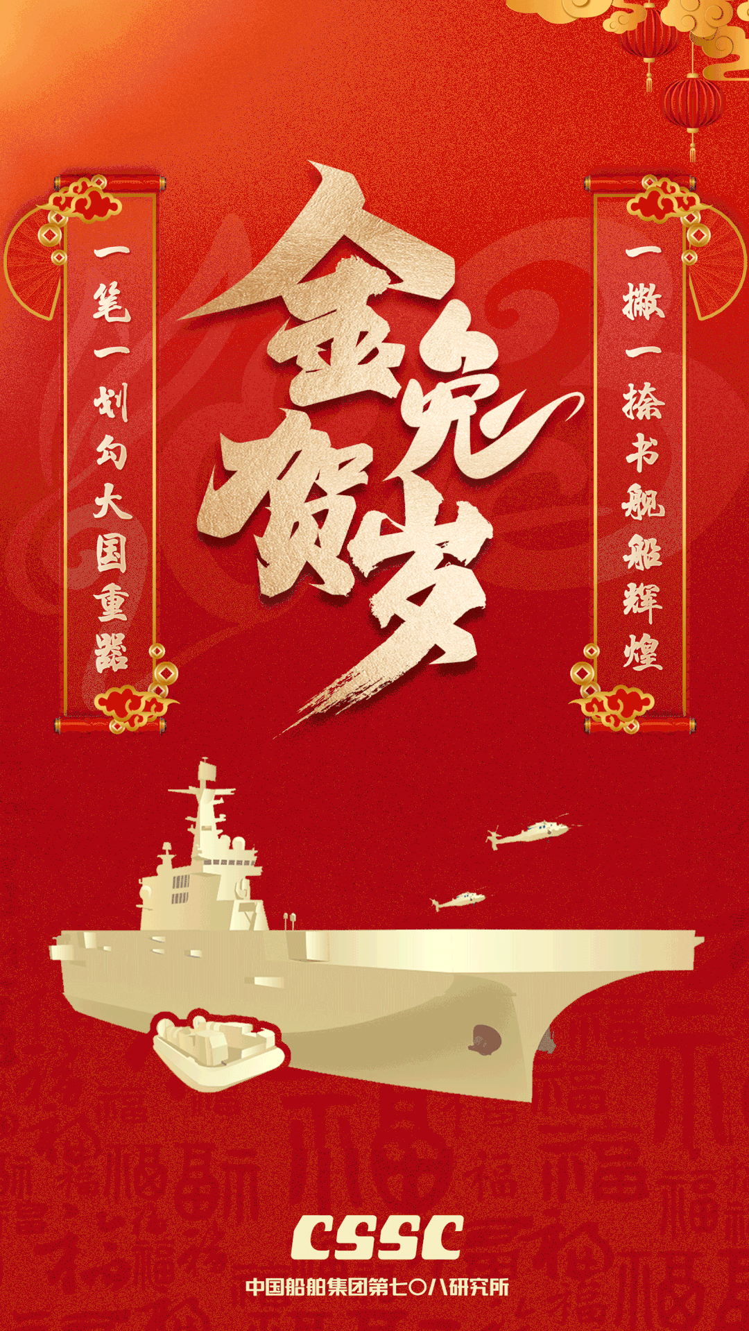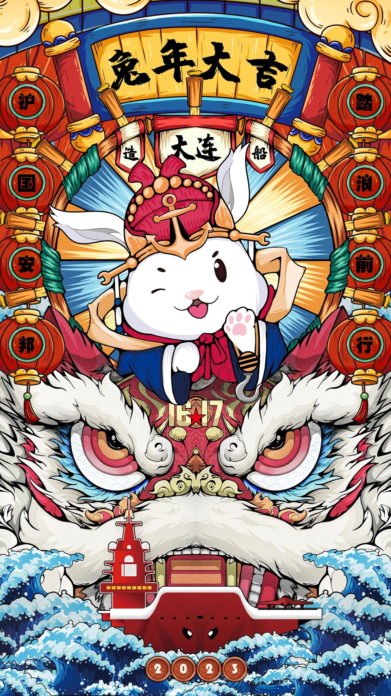 海報中所展現的元素,皆由大連造船元素組成,中間癸卯兔的頭冠裝飾以船錨、舵軸為主,下方航母在海中追風逐浪,象征大連造船必將在新時代發展中踏浪前行。