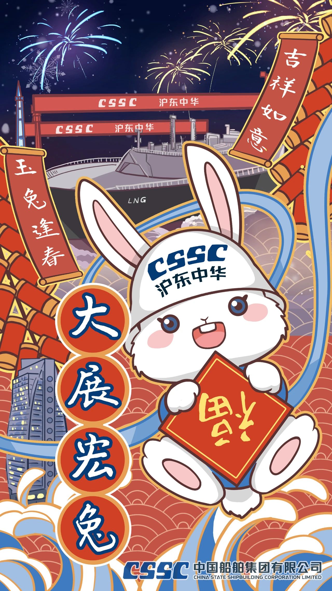 它采用插畫表現形式,勾勒出在煙花綻放的夜空下,滬東中華的龍門吊和LNG船等。玉兔逢春開新局,2023,我們將繼續拼搏,展宏“兔”!