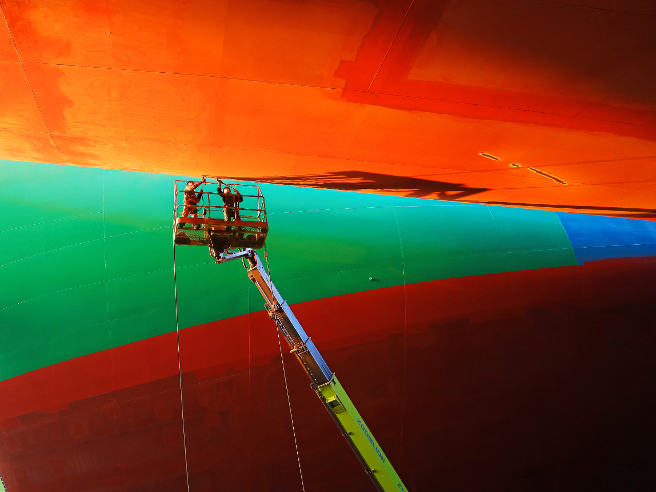 兩位打磨工人駕駛高空車對外板進行清潔施工,這個瞬間,他們如同置身于童話當于一般。