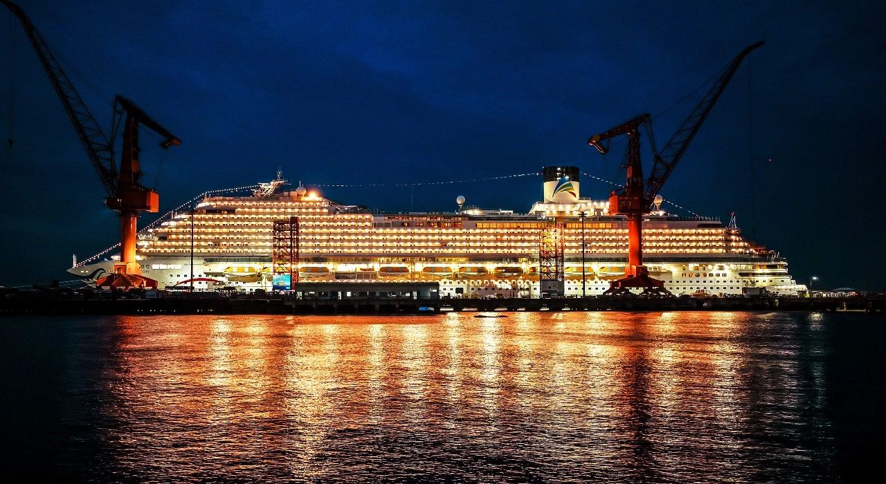 國產首艘國產大型郵輪“愛達·魔都號”,停靠在長江口,燈光電路測試期間,華燈綻放恍如白晝。