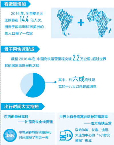 編織一張密度適宜的高鐵網絡,造福盡可能多的民眾。十八大以來,我國高鐵版圖不斷延伸:2013年7月,穿越江南水鄉的寧杭高鐵開通;2014年6月,世界上一次性建成通車里程最長的高速鐵路蘭新高鐵建成通車;2016年12月,滬昆高鐵全線通車,彩云之南不再“邊緣”。截至2016年底,中國高鐵運營里程突破2.2萬公里,超過世界其他國家高鐵里程之和,除幾條線路外,2004年提出的“四縱四橫”高鐵網已全部建成。根據2016年7月新修訂的國家《中長期鐵路網規劃》(2016-2030年),預計到2020年,全國高速鐵路將增加到3萬公里。今年繼續保持高鐵網絡快速建設勢頭,就在上月初,寶蘭高鐵通車,將使千年絲路煥發更加蓬勃的生機。不久后,我們還將見證張呼客專馳騁于遼闊的大草原,而西成高鐵也將讓千年蜀道不再艱難。
