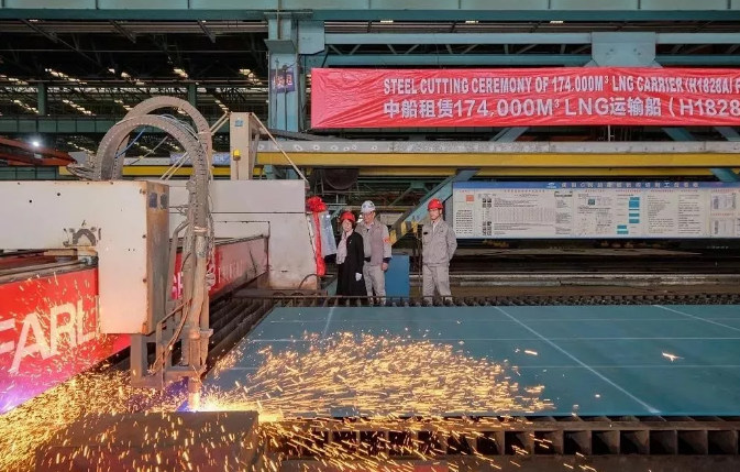????近日,中國(guó)船舶集團(tuán)所屬滬東中華造船(集團(tuán))有限公司為中船租賃建造的17.4萬(wàn)方LNG(液化天然氣)運(yùn)輸船(H1828A)順利開工。