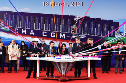 3月18日,中國船舶集團旗下江南造船和中船貿易作為聯合賣方為法國達飛集團建造七〇八所研發設計的23000TEU超大型雙燃料集裝箱船“達飛·蒙馬特”號正式命名交付。“達飛·蒙馬特”號是9艘船中的第六艘,也是江南造船建造交付的第三艘。該船的順利交付,為當前繁忙的國際航運市場注入新活力的同時,也將進一步壯大達飛海運的運輸力量,具有重要里程碑意義。
