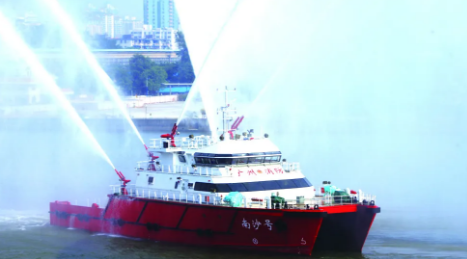 2010年12月28日,廣船國際為南沙區(qū)建造的“南沙號”消防船投入使用。“南沙號”消防船總長46米,型寬15米,排水量達到680噸,航速可達32.4公里/小時,共設(shè)置有6門水炮。其中,2門主炮射程可達到150米,4門副炮射程可達到130米;還設(shè)置了全船水幕保護系統(tǒng),在火災(zāi)現(xiàn)場可有效保護自身安全。“南沙號”消防船是當(dāng)時國內(nèi)最大雙體專勤消防船,大大增強了對船舶火災(zāi)、石化碼頭、油庫火災(zāi)的撲救能力。
