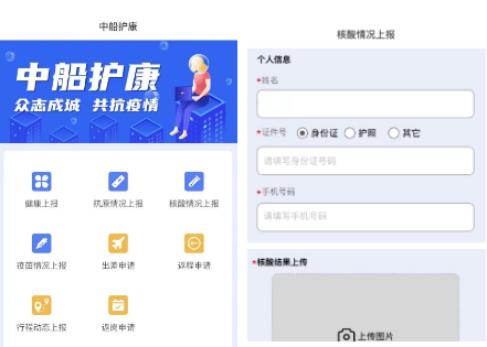 物資公司與樂普(北京)醫(yī)療器械股份有限公司合作開發(fā)的“中船護(hù)康”健康監(jiān)測上報(bào)系統(tǒng),具備員工健康上報(bào)、抗原檢測、核酸情況、疫苗接種、行程動(dòng)態(tài)5種上報(bào)模塊,以及出差、返程、返崗3類申請,共8大功能,在數(shù)字化防疫方面做出了新的嘗試。