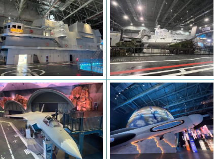 以先進(jìn)武器裝備為原型,館內(nèi)建有全比例、高比例航母艦島、核潛艇、奮斗者號載人深潛器、殲20飛機、運20飛機、天宮空間站、星火號宇宙飛船、99A坦克等,集成聲光電、虛擬現(xiàn)實、動感平臺等對標(biāo)國際一線主題樂園的體驗技術(shù),采用多種體驗形式和手段,編制精彩成長歷險故事,以主題游樂、研學(xué)教育、科普展示、文創(chuàng)商業(yè)等多種業(yè)態(tài),為游客帶來一場高科技、新技術(shù)的軍事主題沉浸體驗。