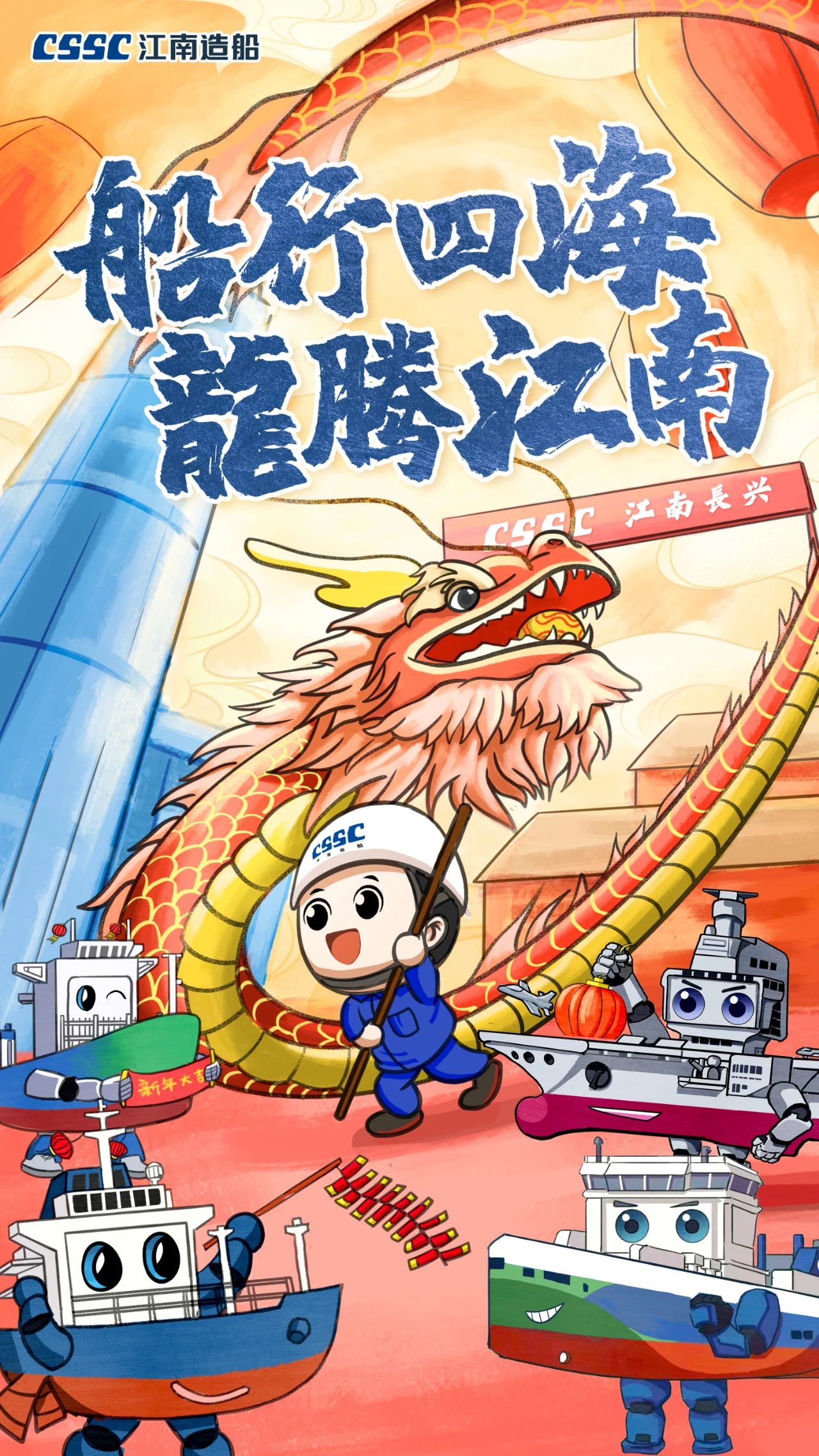 創意說明:海報中“江小南”舞起龍頭,預示著在新的一年,江南造船將賡續努力,龍頭揚起、再創新績!而跟隨舞動的則是目前江南造船在建的集裝箱船、液化氣船和汽車滾裝船等主產品系列。