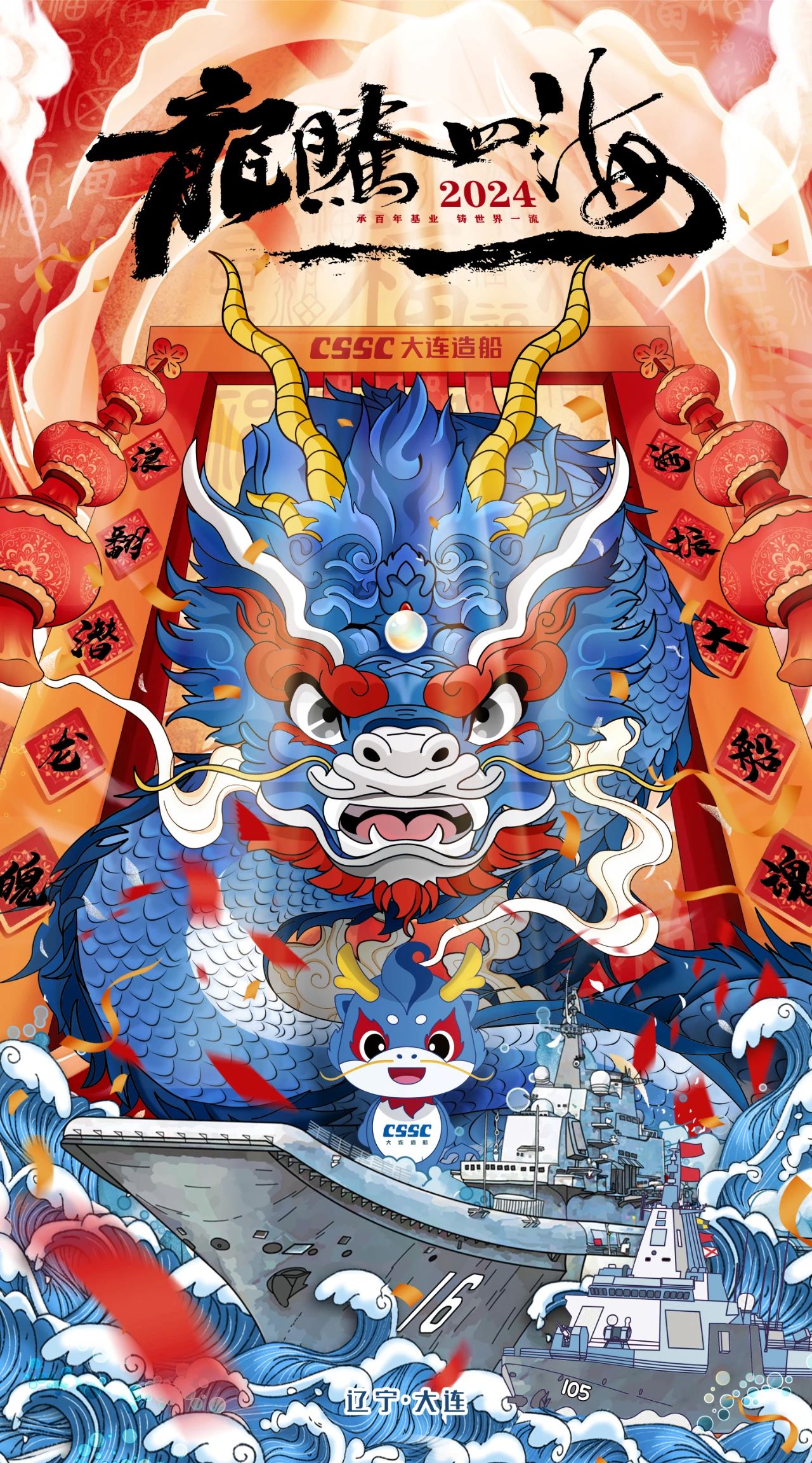 創意說明:采用國潮手繪風格,將中國傳統文化元素和大連造船遼寧艦、大連艦等企業特色相結合,以彰顯造船龍頭企業的榮耀和奮發向上的精神。整體設計采用上中下三個部分的排列方式,比例為1:2:1。