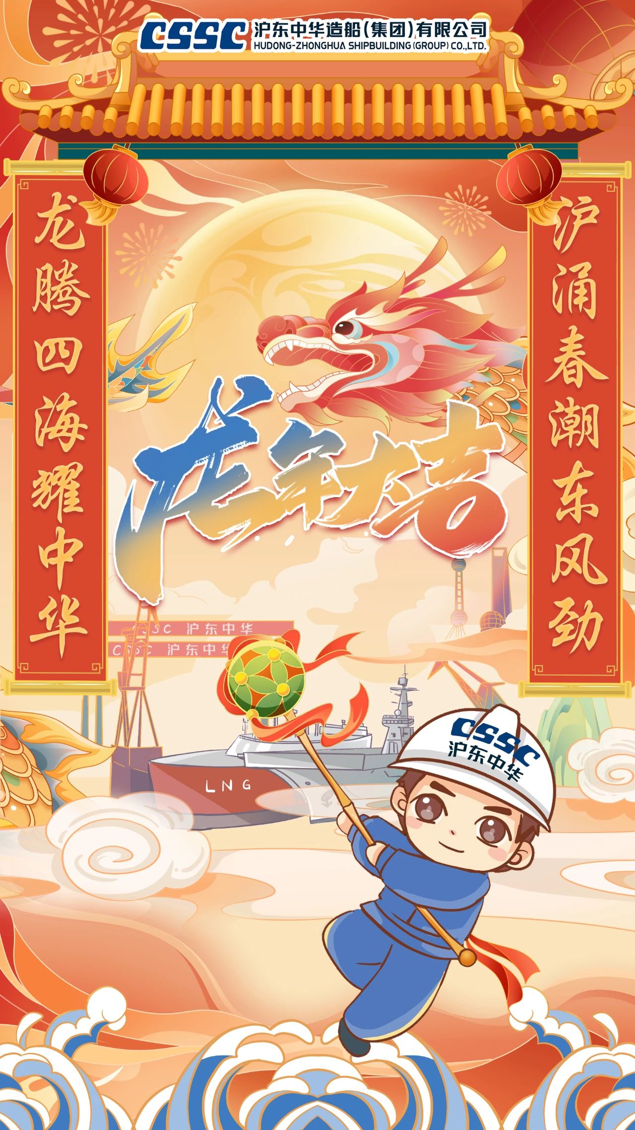 創意說明:海報采用國風設計,以對聯形式布局,以舞龍為海報核心。滬東中華員工手持繡球,引導巨龍前行,并打造出LNG運輸船等產品,體現了滬東中華追風踏浪、勇攀高峰的志向。