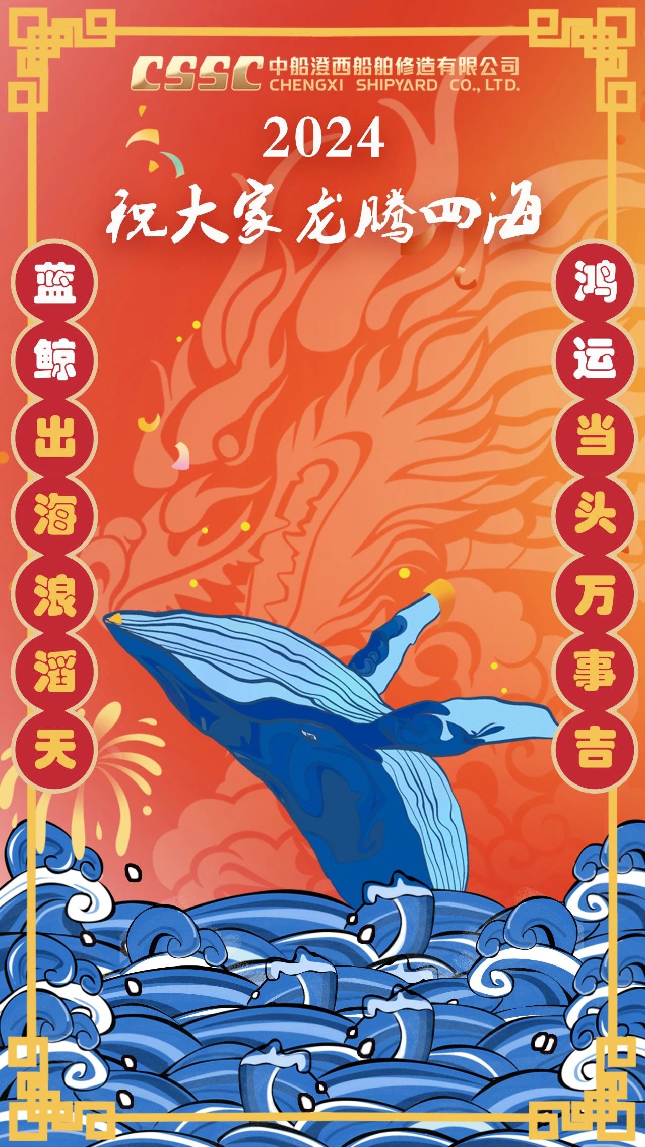 創意說明:海報以龍年為主題,主體為藍鯨。自研8萬噸級散貨船“藍鯨”系列和5萬噸級油化船“鴻運”系列是中船澄西命名的品牌船型,凝結了公司全員智慧。
