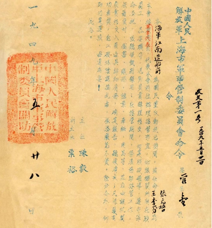江南之于國家的戰略意義,周恩來曾這樣說過:“江南造船所是中國乃至亞洲最大的軍工企業,要爭取在解放軍進滬時,安全、完整地交給人民。”1949年5月27日,上海解放。第二天上海市軍管會主任陳毅、副主任粟裕簽發第一號令,宣布接管海軍江南造船所。華東海軍司令員張愛萍來到江南造船所和工人們一起投入搶修造船設施的勞動中,江南造船在廢墟上獲得新生。