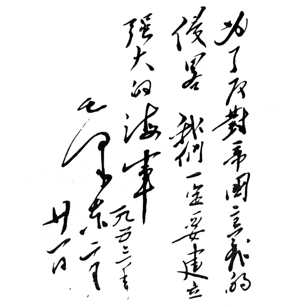 1953年2月19日,毛澤東在武漢登上長江艦視察長江中下游四省,并在長江艦上為海軍題詞:“為了反對帝國主義的侵略,我們一定要建立強大的海軍。”船未行至南京,毛澤東提出要在南京檢閱海軍戰艦。華東海軍立即抽調了“廣州”號和“南昌”號護衛艦、“黃河”號登陸艦,以及101號、104號魚雷艇參加檢閱。幾天中,毛澤東連續5次都寫下同樣的題詞:“為了反對帝國主義的侵略,我們一定要建立強大的海軍”。這是中國領導人對建設強大海軍、建設一流裝備的殷切期望,是新生的中國對建設強大海防的決心。如今這顆刻著偉人囑托的銘石,靜靜矗立在江南造船長興島造船基地行政樓前的草坪,也靜靜地矗立在每一位江南人的心中。