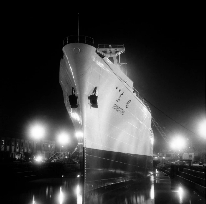 “一五”后期,研制萬噸級遠洋貨船被列為國家新科技規劃的重點項目。在西方長期封鎖尤其是后來蘇聯中止援助的困難局勢下,“東風”號是中國人首次嘗試自行設計、自行建造,全部采用國產設備的首艘萬噸遠洋船。1960年4月15日,“東風”號下水,時任上海市委書記陳丕顯、副市長曹荻秋等人出席下水典禮。萬噸輪被命名為“東風”號。