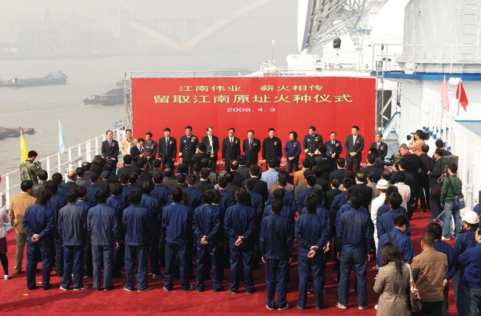 2008年4月,江南造船老廠建造的最后一艘船“遠望6”號航天測量船即將交付。4月3日,時任江南造船搭載部部長黃文飛作為取火者從“遠望6”號船前甲板的上建位置手拿焊槍取火引燃火炬。火炬依次傳遞至勞動模范、三八紅旗手、江南造船領導等,最后傳至時任中船集團總經理陳小津手中并由他點燃了火種盒。6月3日,江南造船人親手建造的船舶特地趕回“娘家”,載著江南“火種”駛往新基地,為新建造的產品開工點火。