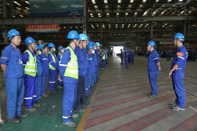武昌造船、中船澄西、中船物資、中船動力和汾西重工等單位按照“五步法”召開班前會,確認人員狀態(tài)及勞保防護裝備;分享安全案例,剖析隱患;細化工作任務(wù),標注風(fēng)險,明確應(yīng)急流程;隨機抽查復(fù)述,組員互查要點;全員齊喊安全或精益口號,提振士氣。