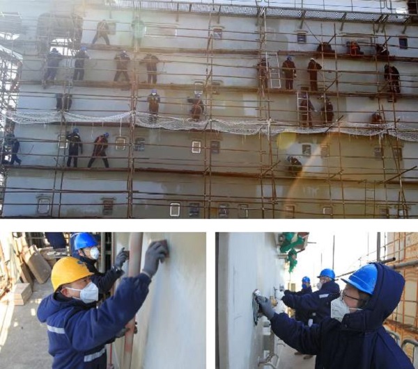 為確保該船按期實現試航節(jié)點,大船集團山船重工先后組織150余名黨員干部投入到該船生活區(qū)外板拉毛工程中。黨員們根據所分配的區(qū)域,站在十幾米高的腳手架上,手里拿著磨砂紙,一點一點地磨,一塊一塊地蹭,不放過每個細節(jié)。