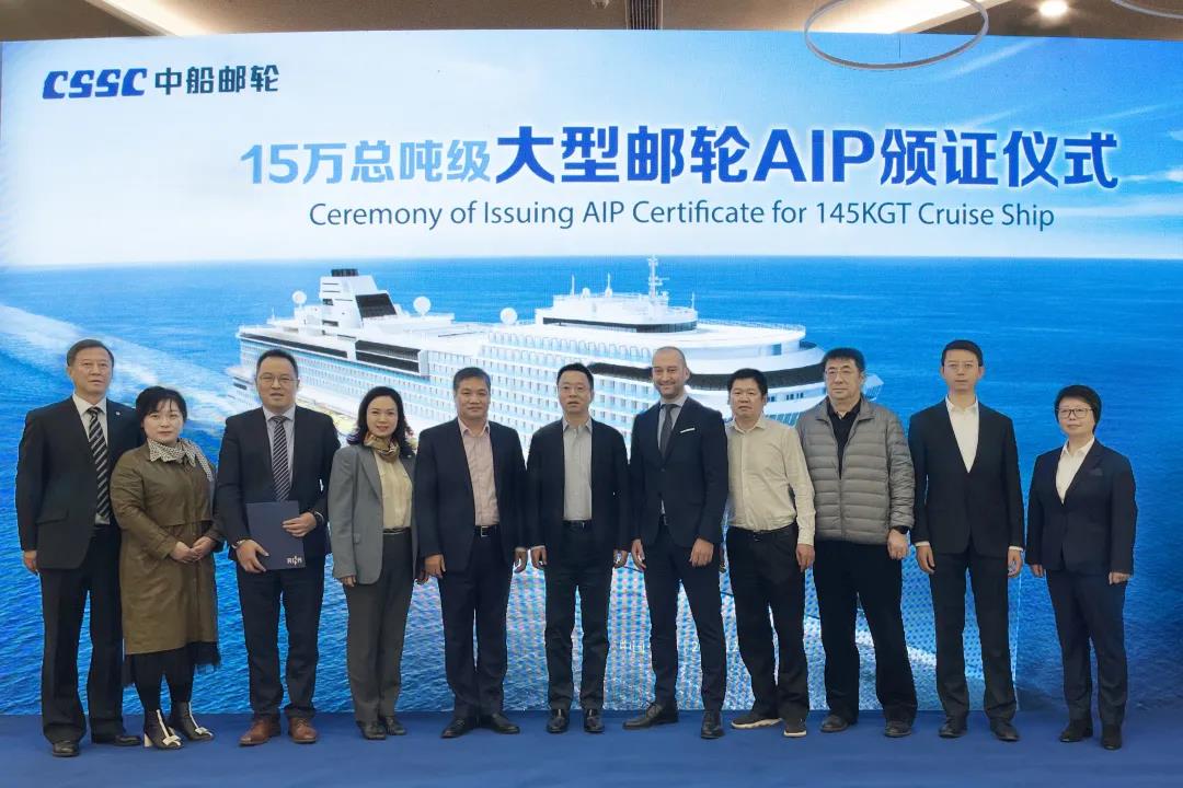 12月9日,中國船舶集團旗下中船郵輪自主研發設計的15萬總噸級大型郵輪獲得意大利船級社原則性認可(AIP)證書。這是中國首次獨立自主研發設計的完全擁有自主知識產權的大型郵輪,一舉打破國外在該領域長期技術封鎖和壟斷,開啟中國大型郵輪自主設計新時代。中國船舶集團黨組成員、副總經理盛紀綱出席授證儀式并講話。