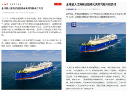 2月18日,中國船舶集團旗下滬東中華聯合中船貿易建造的8萬立方米液化天然氣(LNG)運輸船“大鵬公主”號在中船長興造船基地命名交付。這是繼中國首艘國產大型14.7萬立方米LNG船“大鵬昊”號之后,為同樣位于深圳大鵬灣區域的華安LNG岸站配套的第一艘LNG船,是滬東中華建造的以“大鵬”灣為背景命名的第四艘LNG運輸船,也是滬東中華2023年完工交付的首艘LNG船,全面開啟LNG船產能倍增戰略實施新征程。