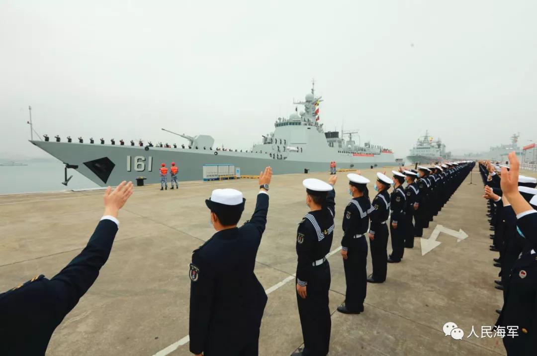 軍樂(lè)隊(duì)奏響《歡送進(jìn)行曲》,編隊(duì)艦艇依次解纜,緩緩駛離碼頭,任務(wù)官兵整齊列隊(duì)、士氣高昂,向祖國(guó)和人民揮手告別。