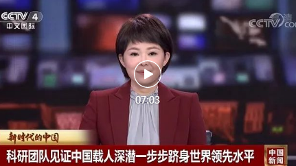 系列報(bào)道《新時(shí)代的中國(guó)》之《科研團(tuán)隊(duì)見證中國(guó)載人深潛一步步躋身世界領(lǐng)先水平》,于9月25日在央視中文國(guó)際頻道《中國(guó)新聞》欄目和《今日環(huán)球》欄目面向全球播出。