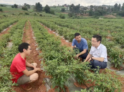 ▲洪術(shù)華(右一)在種植基地查看辣椒長勢(shì)